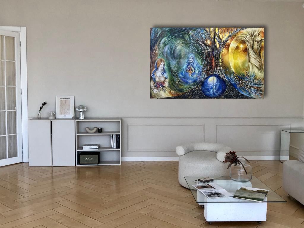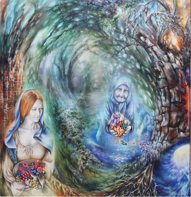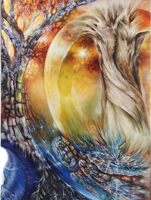 Древо рода, в корнях которого открывается путь к вечным ценностям. Вечный круговорот событий, жизней, символов, истинных богатств. В основе идеи работы Верхний зодиак под названием Древо. У картины две части. Великое Древо находится в разломе – это выход в высший зодиак, две картины собираются как два знака зодиака. Работа посвящена предкам: Занырни в прошлое и привнеси дары-знания в свое будущее. Дары - истинные ценности, приносятся из родовых программ в будущие поколения.