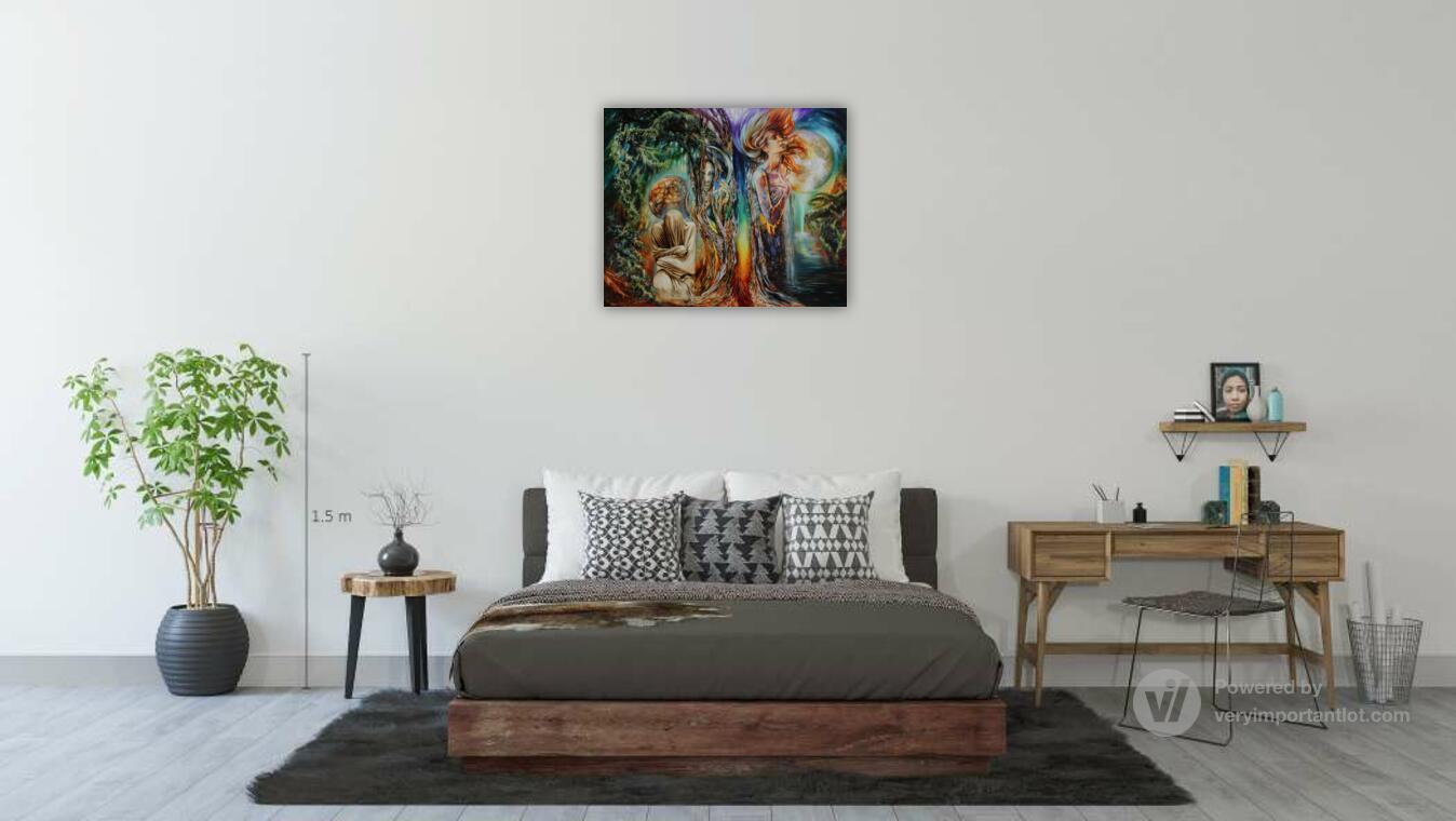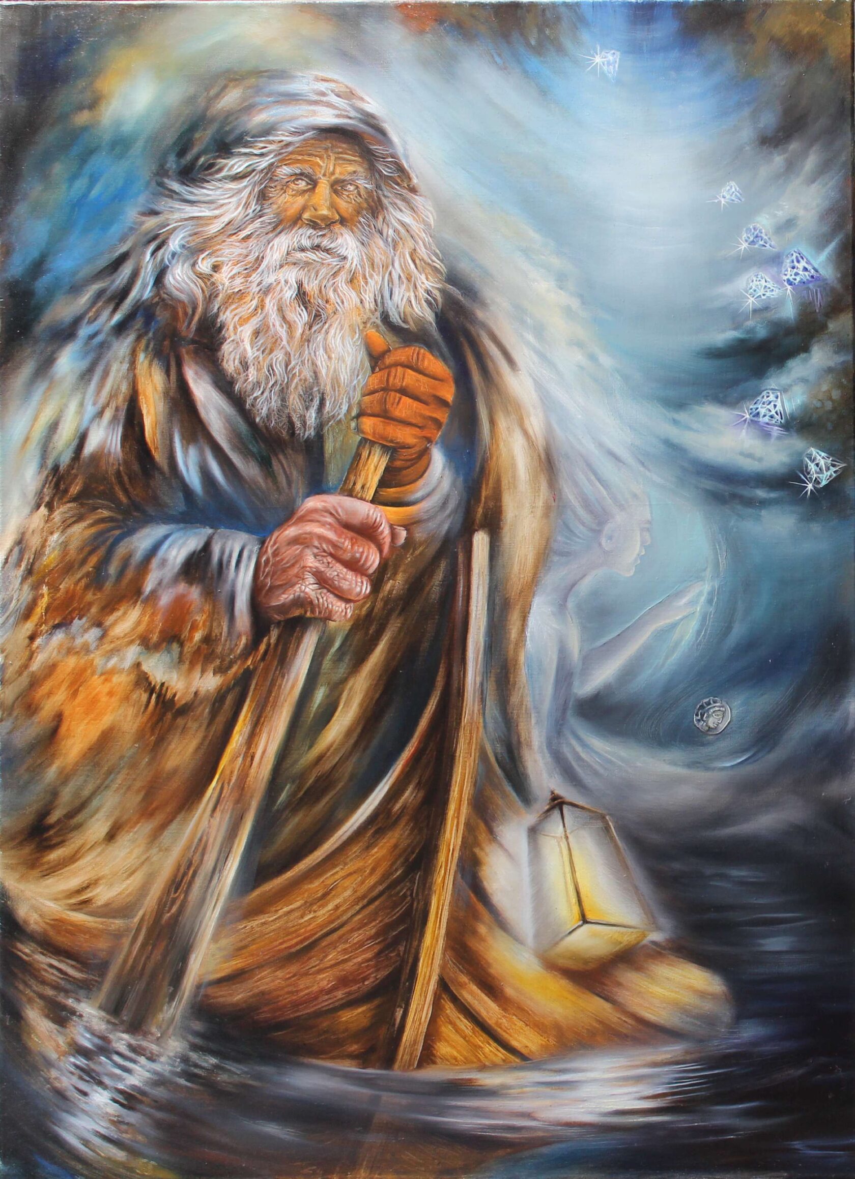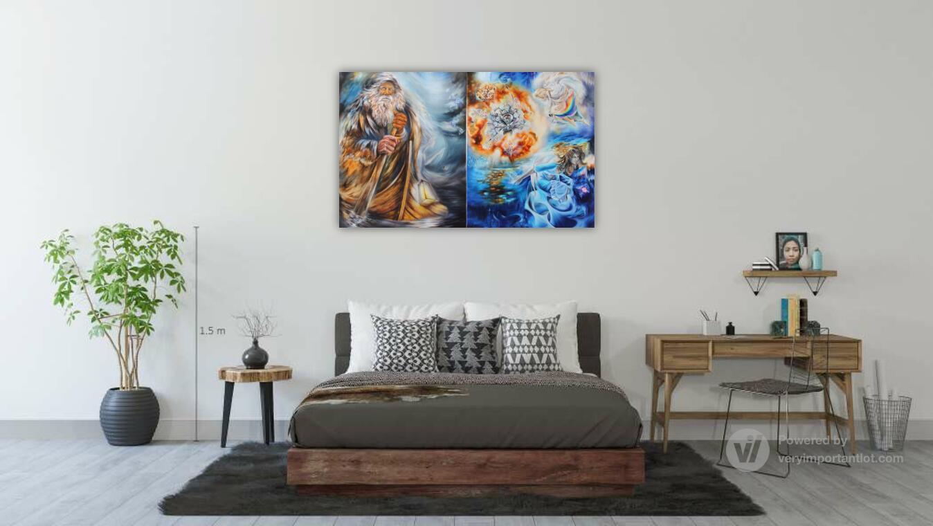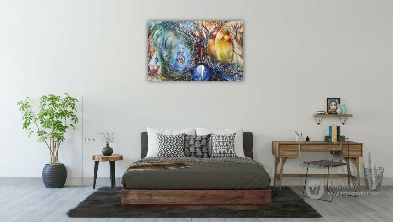 В левой части диптиха нас встречает древнегреческий миф о необратимом течении времени и судьбы. Хронос, бог времени, здесь метафорически явлен в образе старца Харона, перевозящего души через реку Стикс. Душа, оплатившая путь монетой (обол), изображена как прозрачная сущность. Падающая в тёмные воды монета открывает портал в иное измерение, символизируя точку невозврата — миг, когда прошлое окончательно отделяется от будущего. Этот сюжет — аллегория линейного времени, которое уносит всё в своём потоке.