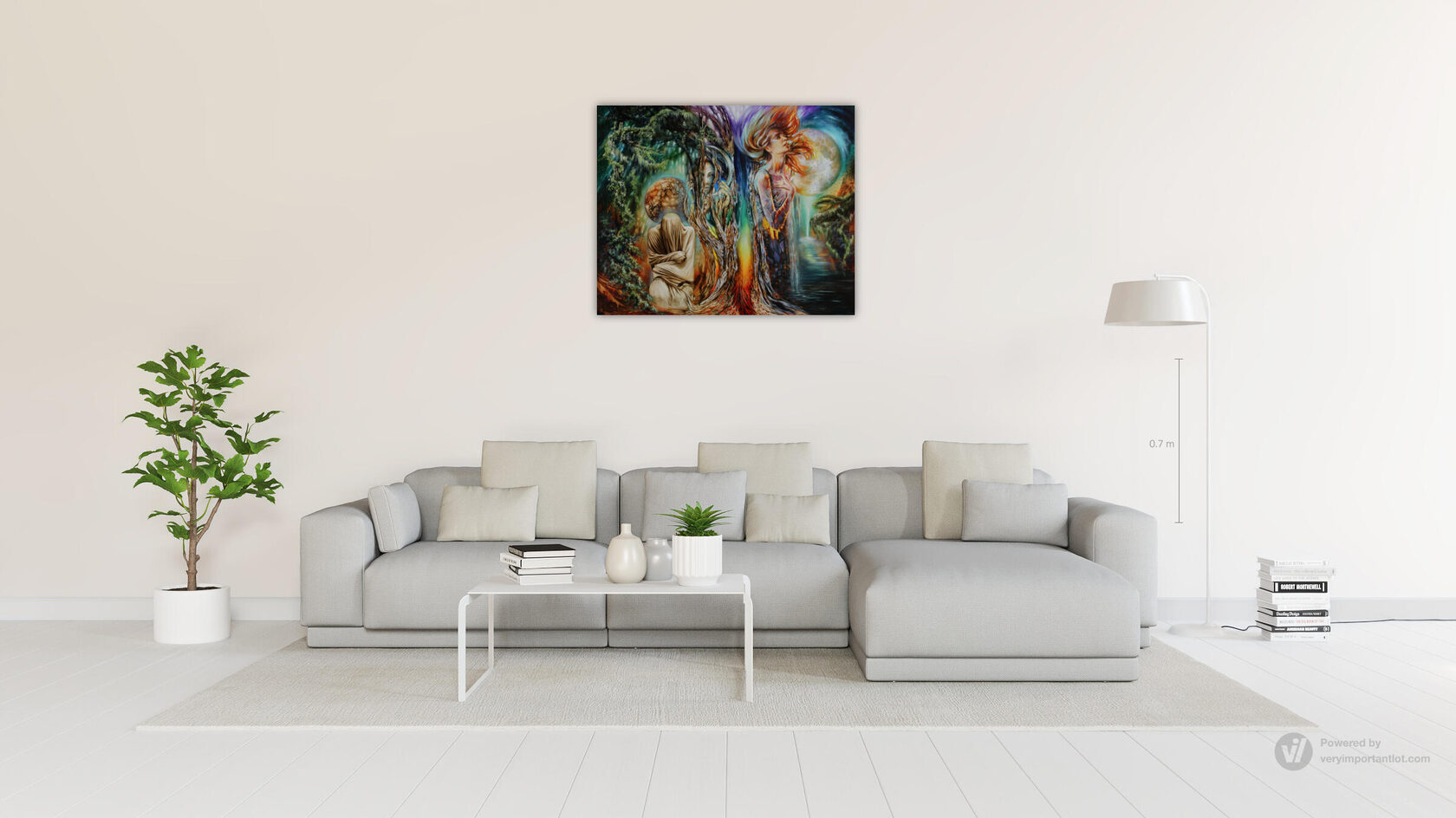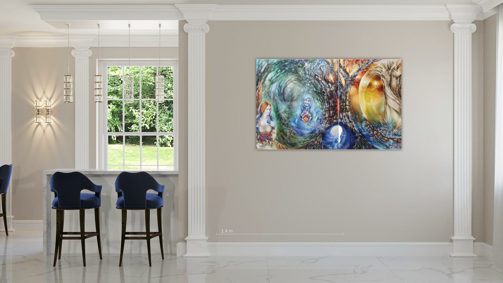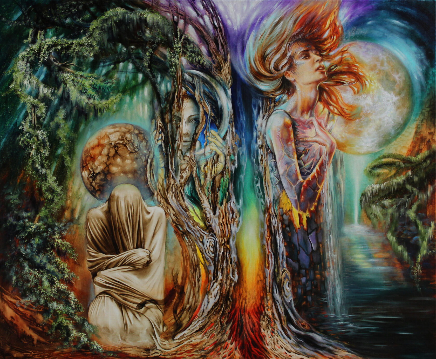 В левой части диптиха нас встречает древнегреческий миф о необратимом течении времени и судьбы. Хронос, бог времени, здесь метафорически явлен в образе старца Харона, перевозящего души через реку Стикс. Душа, оплатившая путь монетой (обол), изображена как прозрачная сущность. Падающая в тёмные воды монета открывает портал в иное измерение, символизируя точку невозврата — миг, когда прошлое окончательно отделяется от будущего. Этот сюжет — аллегория линейного времени, которое уносит всё в своём потоке.