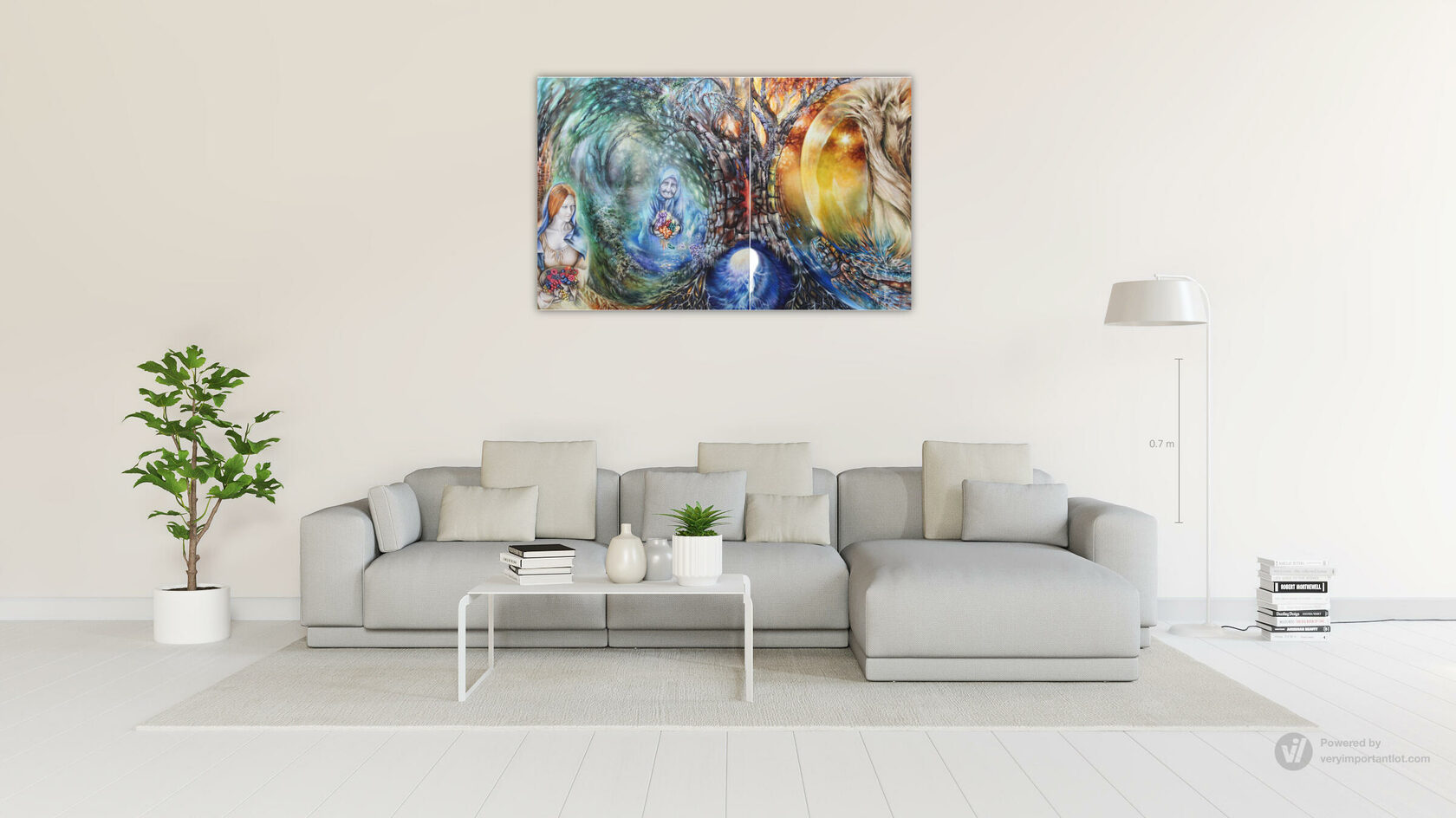 Идея диптиха: Художник создаёт единое мифологическое пространство, соединяя древнеегипетский символизм с универсальными архетипами. «Разлом» — это не просто элемент верхнего зодиака, это зона перехода, где происходит главный суд — не внешний, а внутренний. Левая часть — это закон и мера, правая — путь и его результат. Вместе они рассказывают историю о том, что истинная сила и новые возможности рождаются не извне, а из глубины пройденного и осмысленного пути, ведущего к внутренней свободе и лёгкости бытия.
