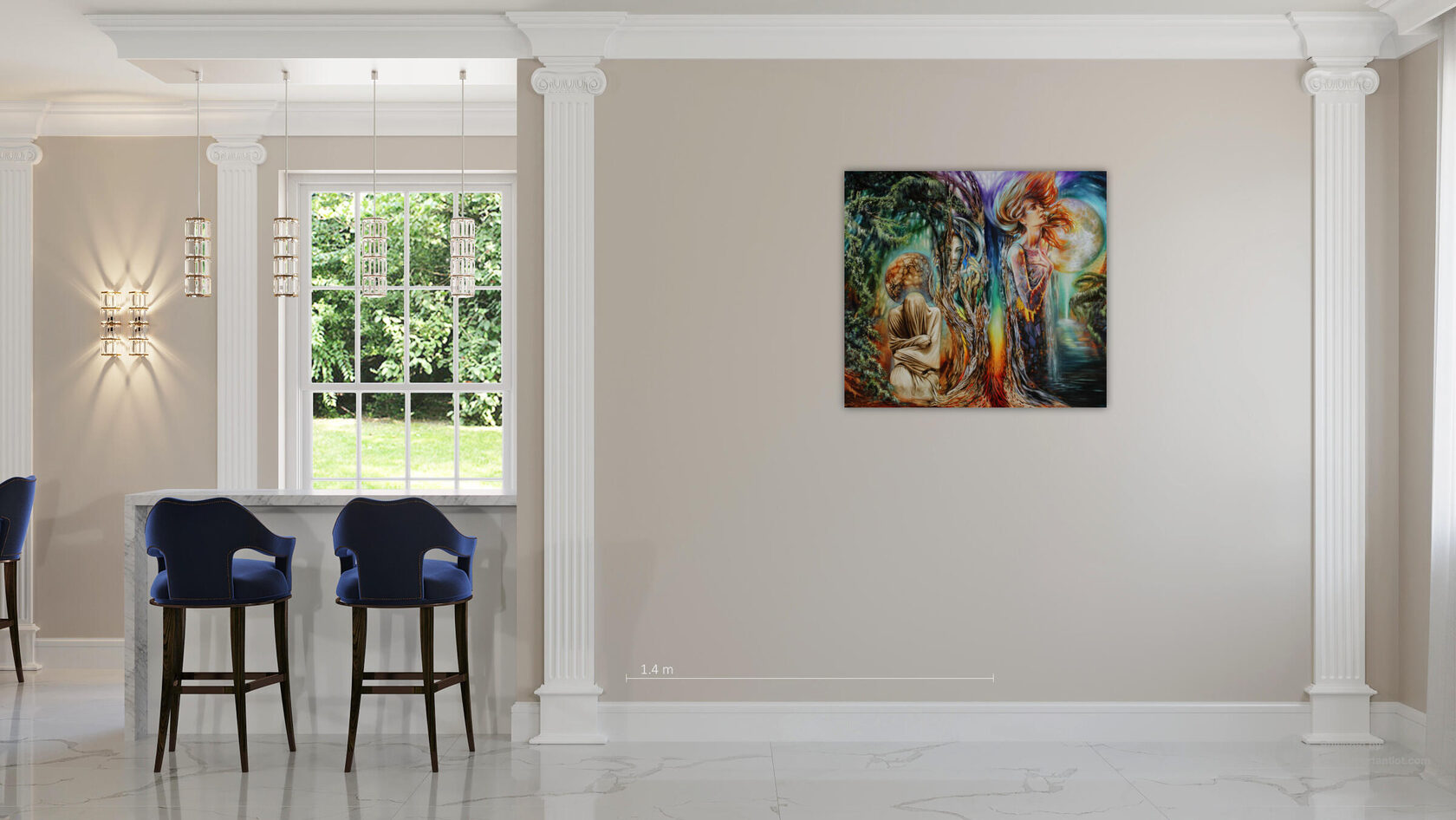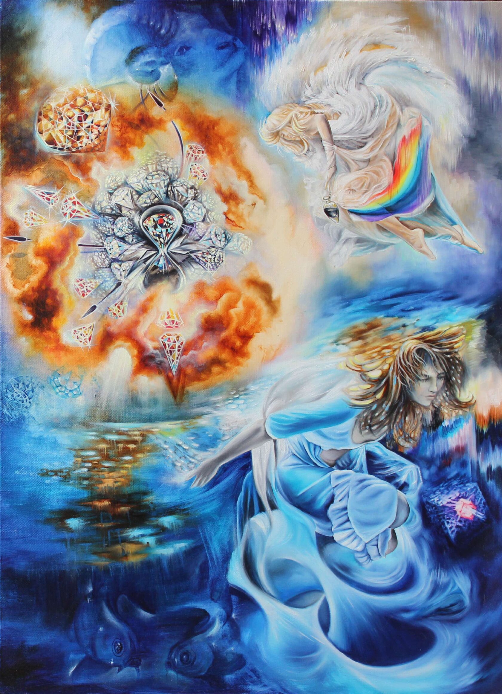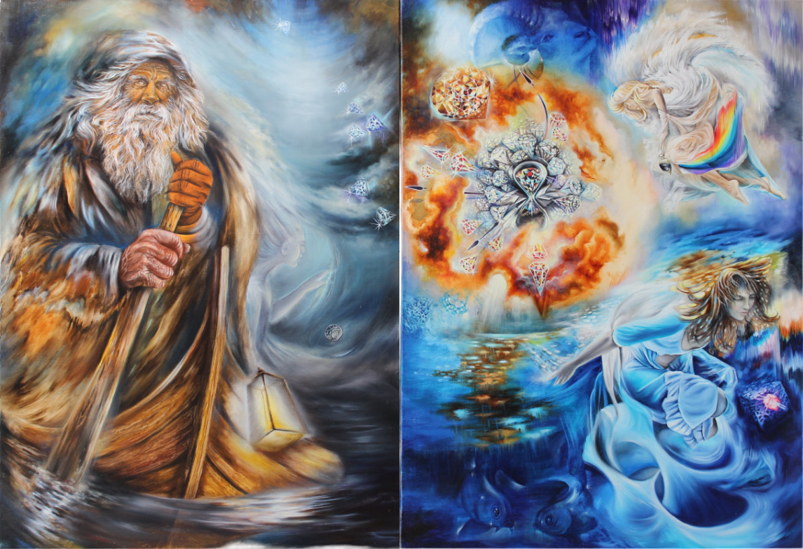 Идея и символизм: Над всем диптихом, в космической туманности, сияют кристаллы времени, а богиня радуги Ирида — единственный вестник, свободно летающий между мирами, — несёт сосуд с водой Стикса. Эта вода была основой нерушимой клятвы богов, что подчёркивает абсолютный и закономерный характер высших законов бытия. Картина является синтезом мифа, космологии и современной физики. Она обращается к концепции верхнего зодиака, существующего в «разломах» привычного, подобно цепочке ДНК, позволяющей эволюционировать на новый уровень. «Хронос» — это размышление о том, как неизобразимые концепции времени и пространства находят своё воплощение в древних архетипах, и как вечное движение между мирами, веществом и пустотой формирует ткань реальности. Это напоминание о том, что всё — миф, космос, наука и человеческая душа — глубоко и неразрывно взаимосвязано.