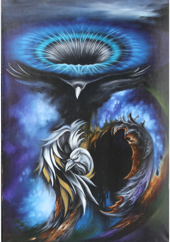 Правая часть диптиха представляет динамичную стихию трансформации через образ двух воронов — чёрного и белого. Они запечатлены в вечном движении, ныряющими через пространство «разлома». Чёрный ворон, погружаясь в бездну, символизирует путь познания, принятия испытаний и силы рода, которые он несёт из небытия. Выныривающий белый ворон — это образ просветления, мудрости и нового рождения. Их полёт олицетворяет двойственность бытия и алхимию души: только пройдя через опыт, обретя знание и взрастив дух, существо может преобразиться. Его «сердце» становится легче пера, подобно этой белой птице.