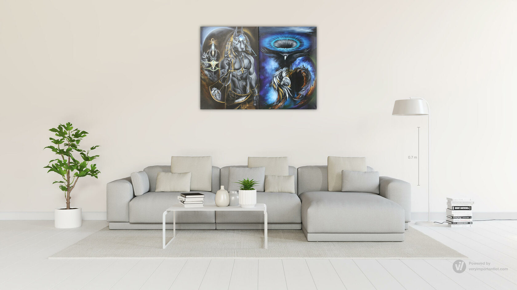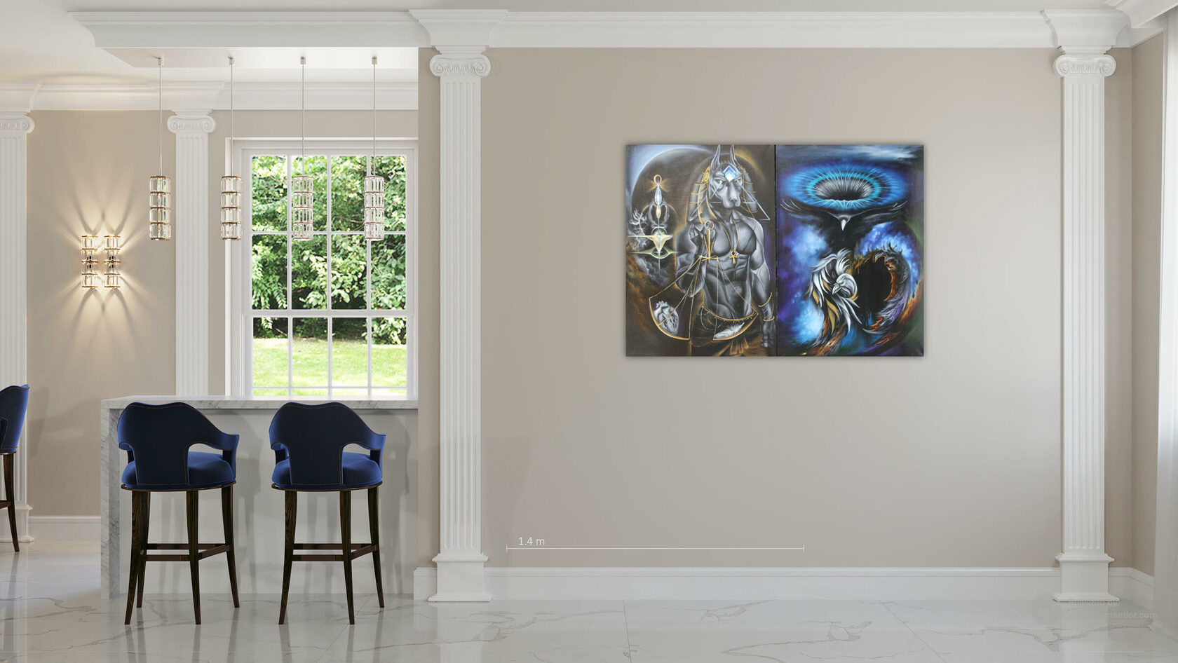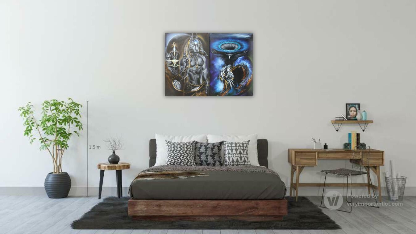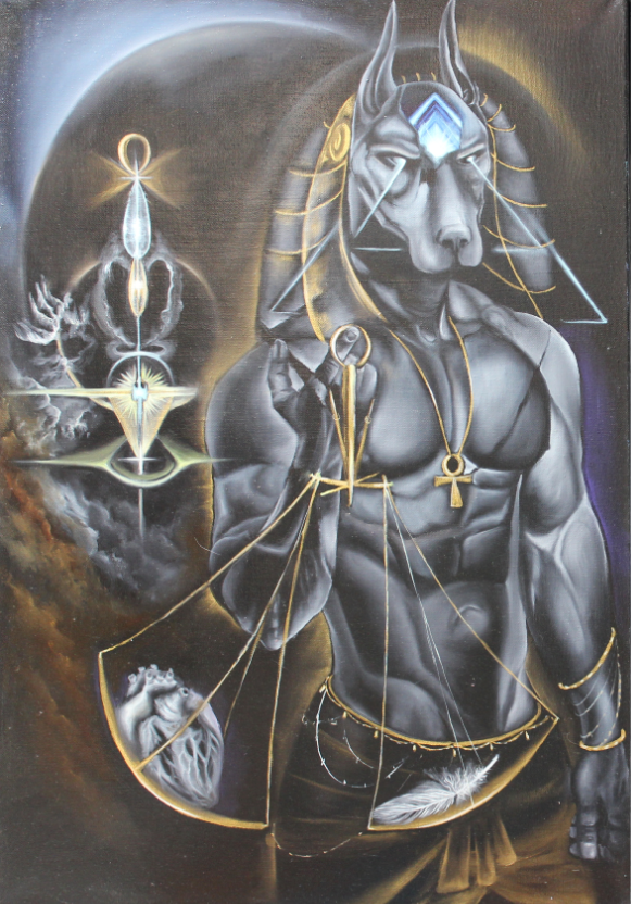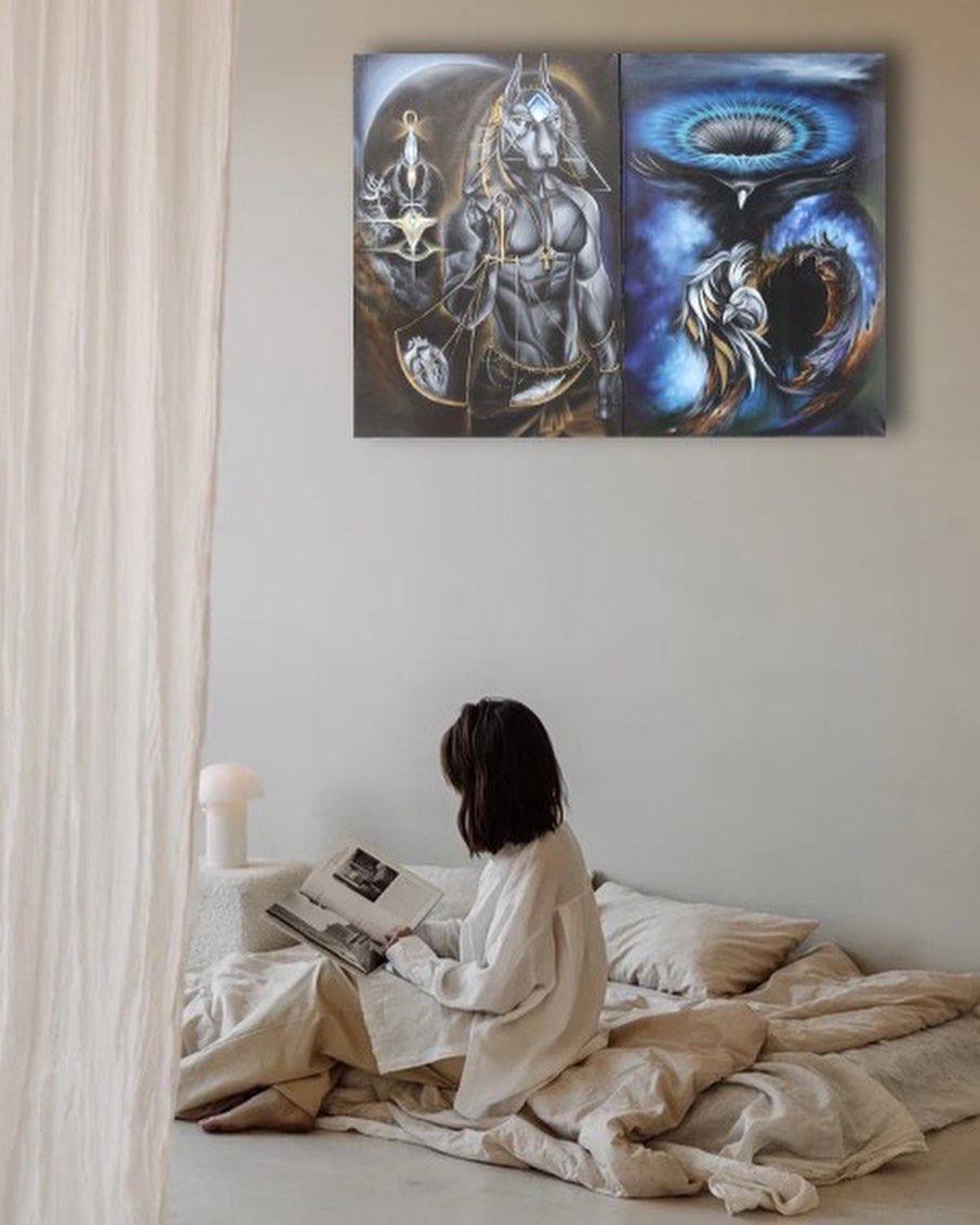 Левая часть: «Анубис. Хранитель Порога» В левой части диптиха нас встречает Анубис — древнеегипетский бог-проводник, представленный здесь как архетип трансформации и стража порталов между мирами. Его фигура, увенчанная головой шакала, является осью, вокруг которой вращается космический порядок. В руке он держит посох «Арх» — инструмент, открывающий врата в иные измерения. Центральный символ — весы, на которых душа проходит последнее испытание: её сердце должно быть легче пера белого ворона. Это аллегория абсолютной духовной чистоты: сердце, свободное от тяжести порока и страха, наполненное лишь любовью, обретает право на переход.