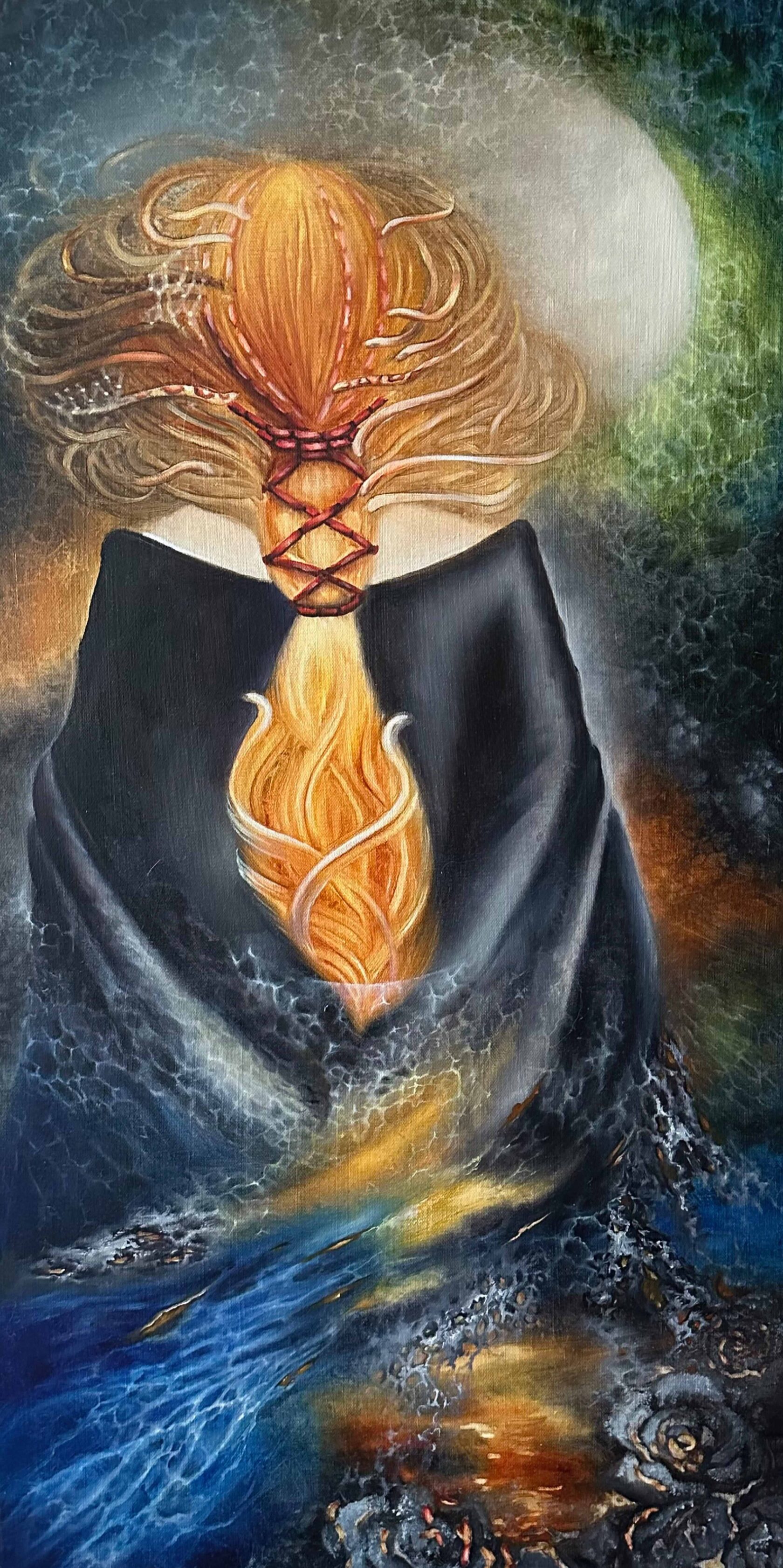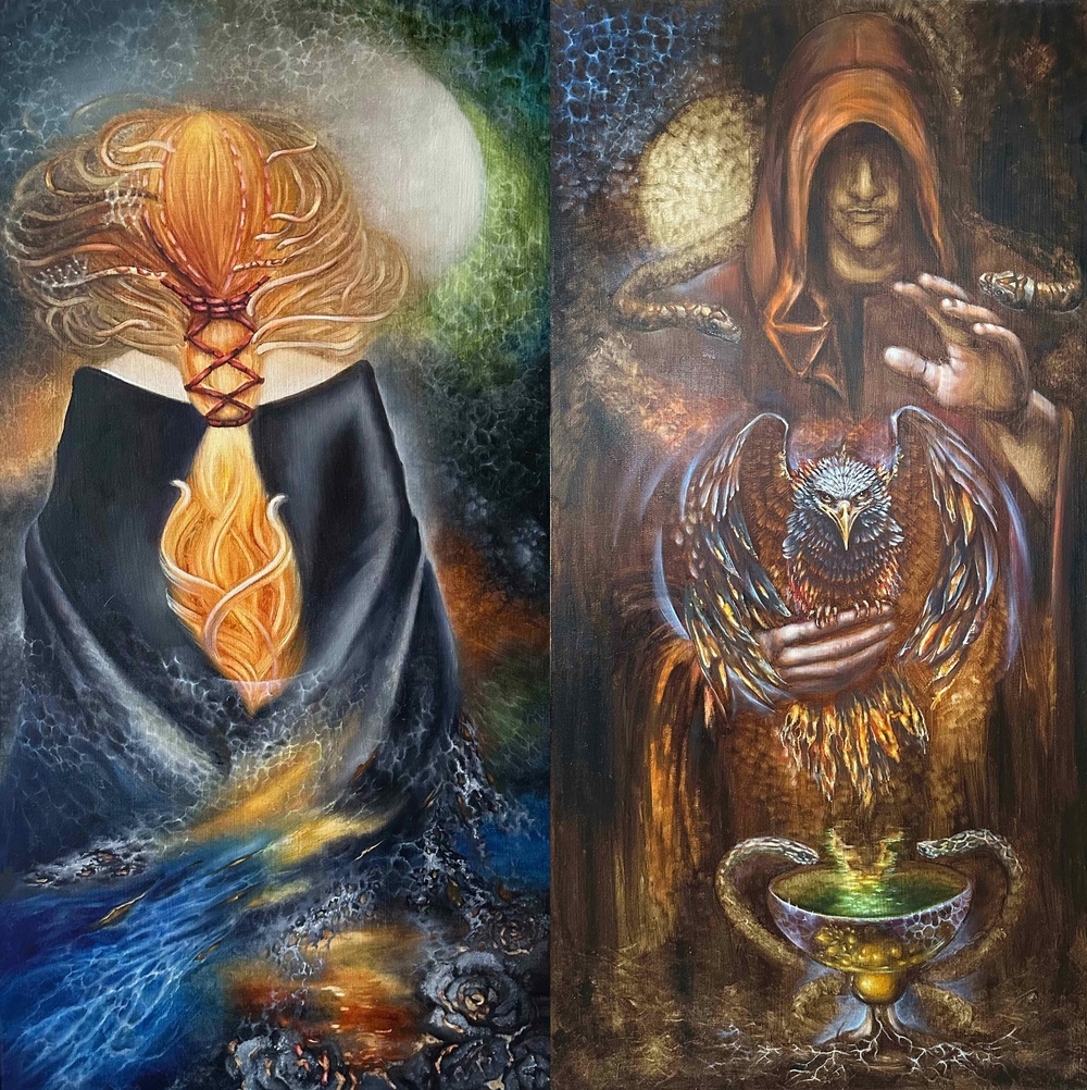Картина состоит из 2-х половин: Слева - изображен сожженный путь и Медуза Гаргона, которая стоит спиной и идет вперед к своей трансформации. По легенде медуза-гаргона была очень красивой девушкой, ее полюбил бог, она была невинной девушкой, и ее постигла несправедливая кара. Змеи на голове – это активация всех блоков, зависимостей, негативных моментов, они все как будто выходят на поверхность и шипят. Она идет с ними в коридор трансформации, в центре двух соединенных картин это видно. Это проход во времени и пространстве. Справа - изображен сам Змееносец. Это врачеватель, который использовал яд змей и достиг настолько больших успехов в целительстве, что смог оживлять мертвых. За это высшие силы забрали его и превратили в созвездие, потому что нельзя вмешиваться в человеческие жизни и судьбы. На плечах у него змеи и перед ним птица Феникс как символ рождения в новую жизнь, во что -то иное. Змееносец связан с легендой о сожженном пути Фаэтона. Сожженный путь Фаэтона, это когда человек сгорает и возрождается из пепла, как и птица Феникс.