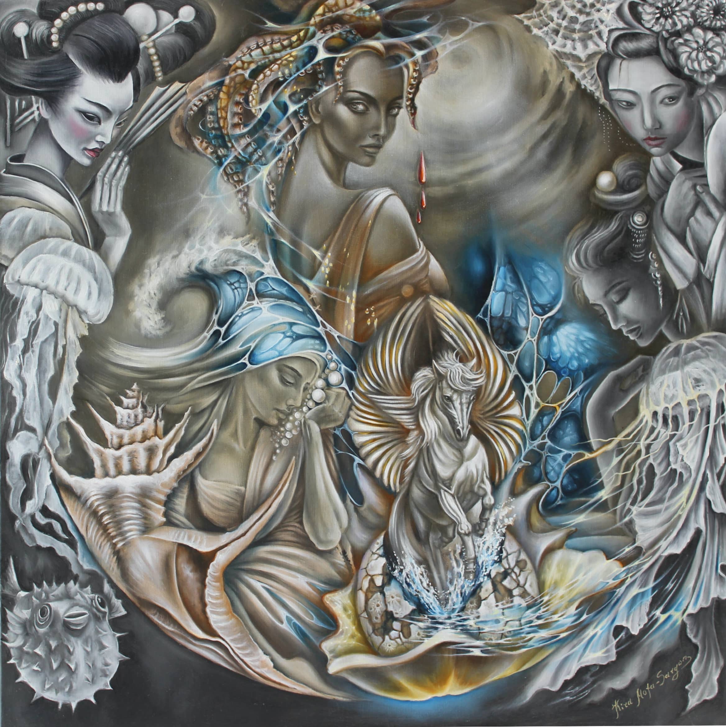 В прочтении художницы в центре — Медуза Горгона, переосмысленная как хранительница священных границ. Её змеи — не орудие проклятия, а короны из живой энергии, сплетенные в узоры золотого сечения. Из её слезы рождается капля крови, превращающаяся в Пегаса — крылатого коня, чьи крылья повторяют форму морской раковины (спираль Фибоначчи), как символ покровительства искусств и всего творчества. Пегас на камне у своего источника. Окружен множеством раковин, все они несут символику спирали Фибоначчи, как основу этого мира- визуализация божественного замысла в природе.