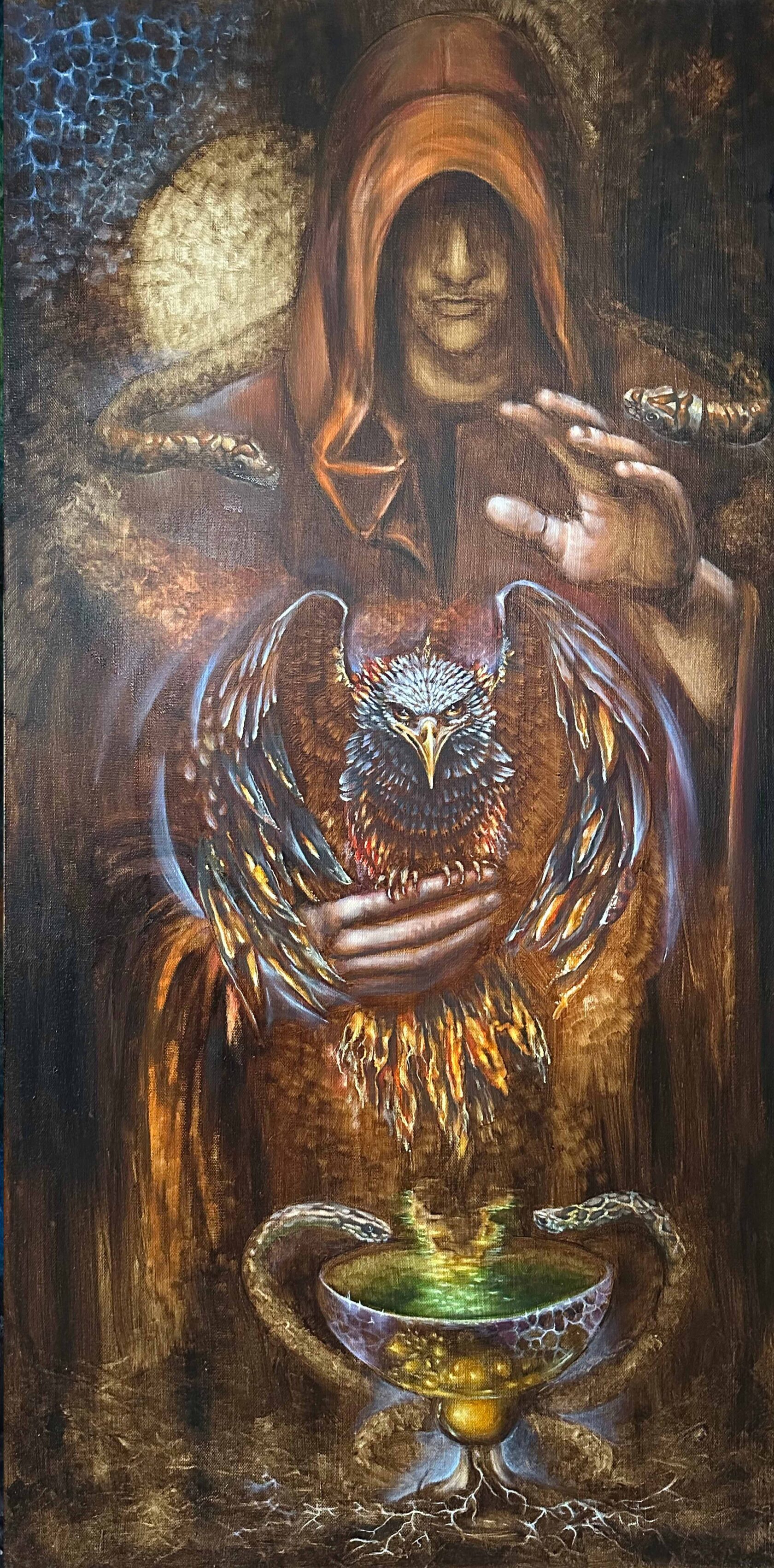 Суть картины в том, что человек может пройти трансформацию и возродиться заново как птица Феникс, оставив все, что отжило, что мешало двигаться вперед, все, что отягощало. Выйти новым человеком, переродиться. 13-й знак зодиака, один из знаков зодиака верхнего круга. Считается, что это соединяющий момент между двумя зодиаками, тот кто прошел трансформацию, тот вышел наверх.