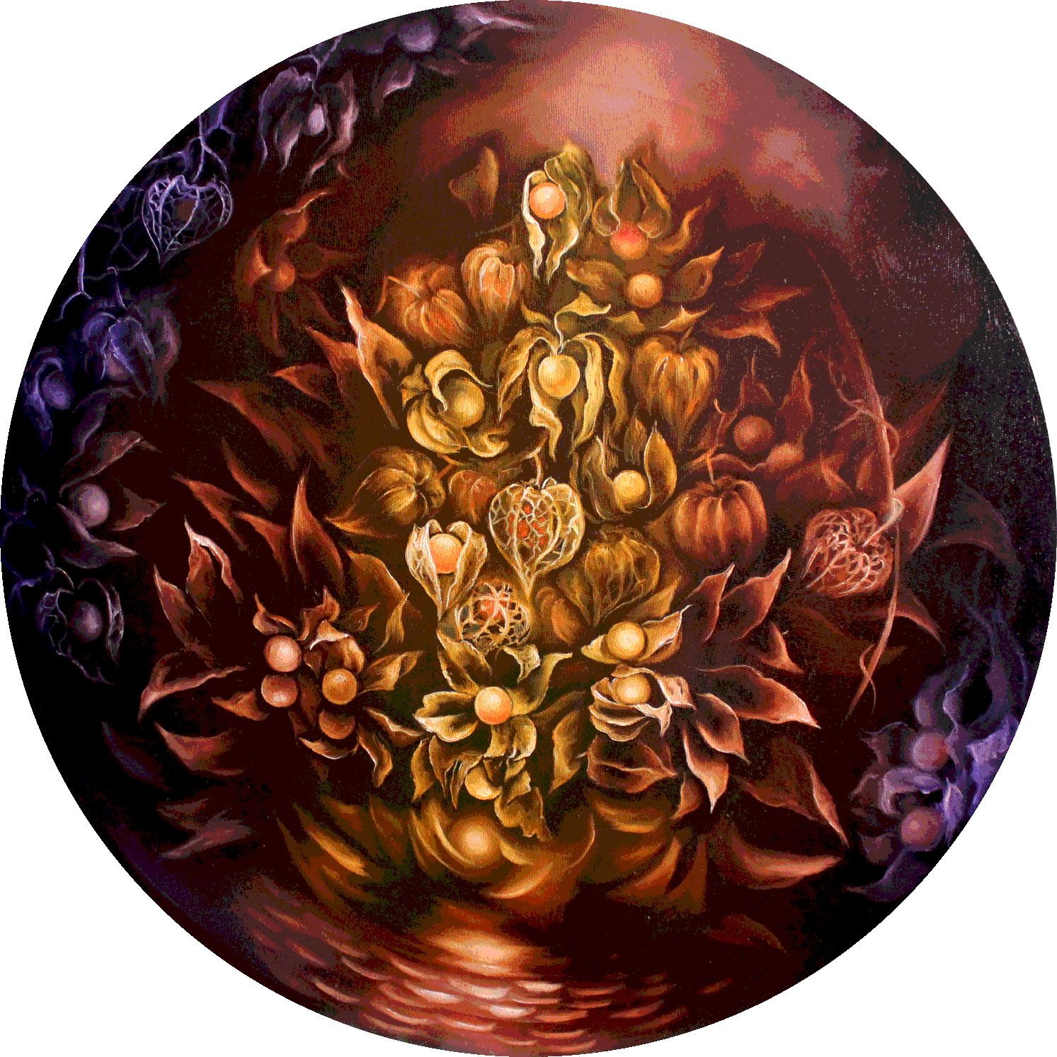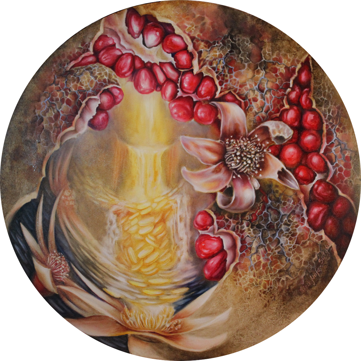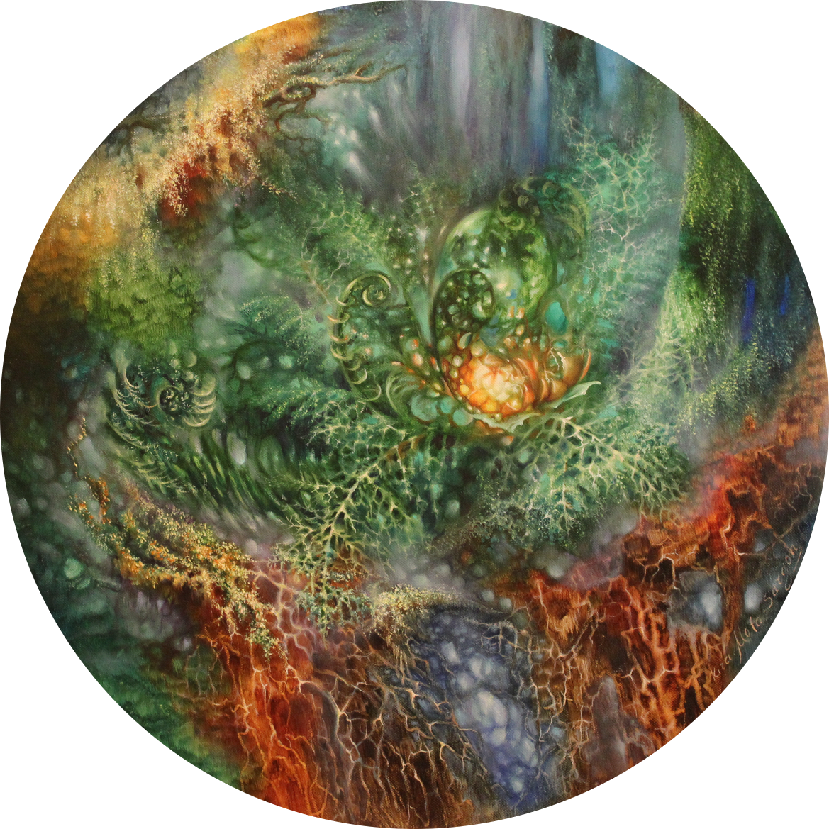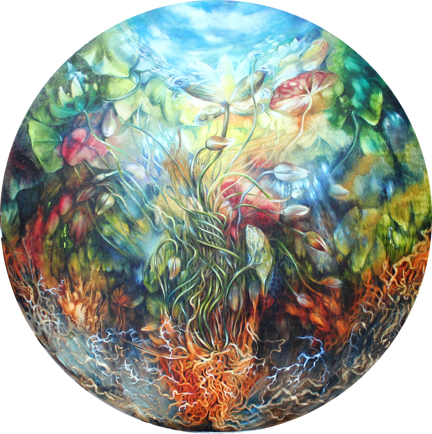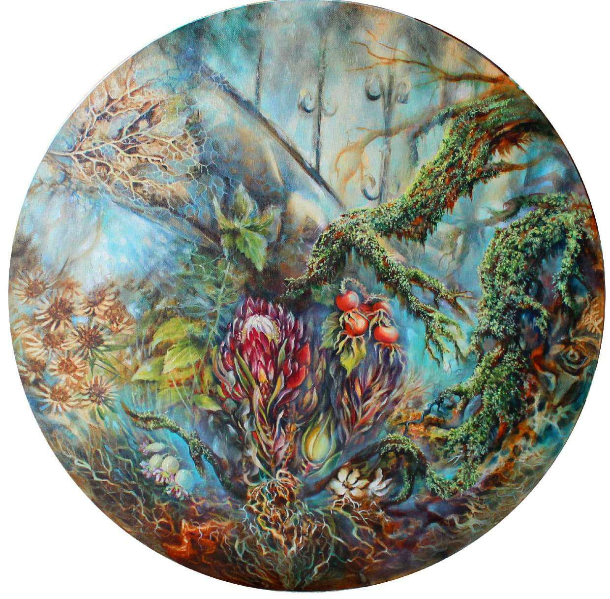 Это взгляд изнутри, из под земли в небо… В этом мире и цветении завораживает переплетающаяся паутина корней, уходящая глубоко в землю, как и наша жизнь. Мы тут растем и цветем, а где-то в глубине - загадка происхождения. Рисуют цветы, но это поверхностно, ведь главное внутреннее содержание и глубинные вещи – это корни. Изначально любой человек безумно красивый, потому что изначально он - растение на этих великих корнях энергий и прошлых жизней.